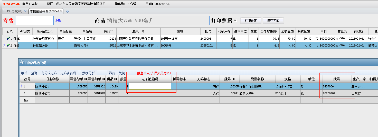 按下 * 键结算的时候,会弹出溯源码扫码框,有码状态的货品,必须扫码才能卖出去,否则会被拦截,无码状态的货品,不扫码也可以销售出去.使用医保账户结算无码且不在白名单中的药品,医保不予支付,费用由门店自行承担.