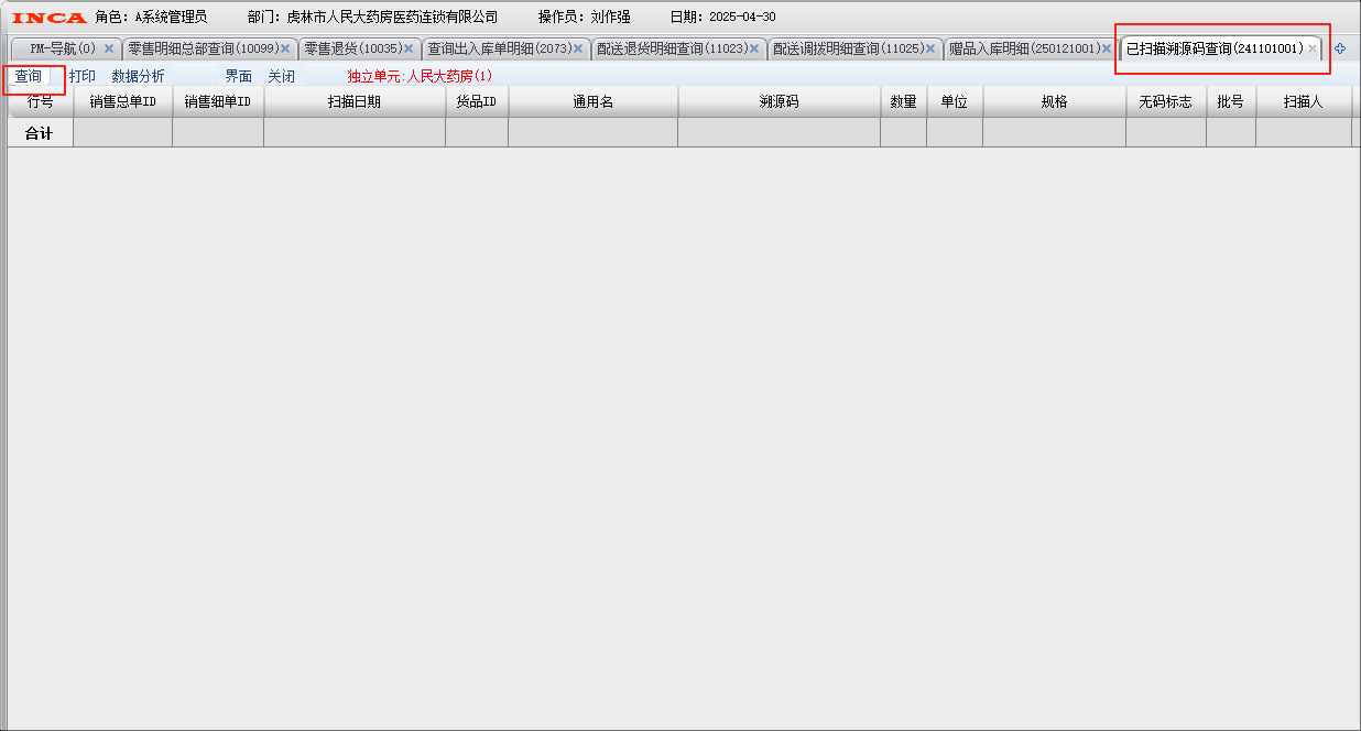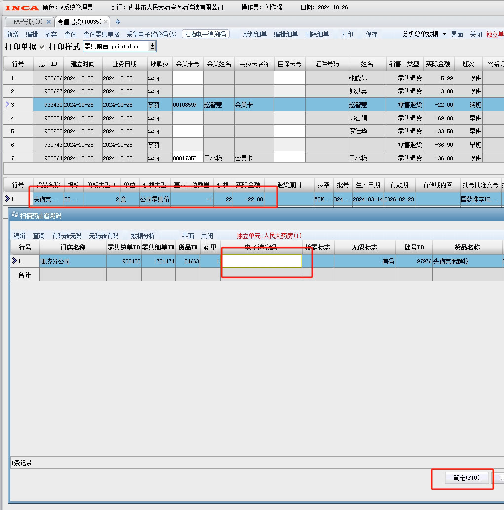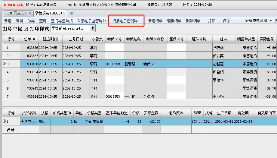 零售退货(10035) 先按正常流程完成退货.然后在完成退货的单据上,单击"扫描电子溯源码"按钮.