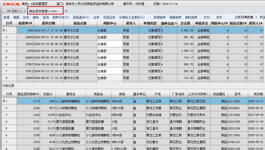 在门店货品返货的时候,必须票货同行,禁止使用手写退货单,配送退货单打印在配送退货管理界面(11022)