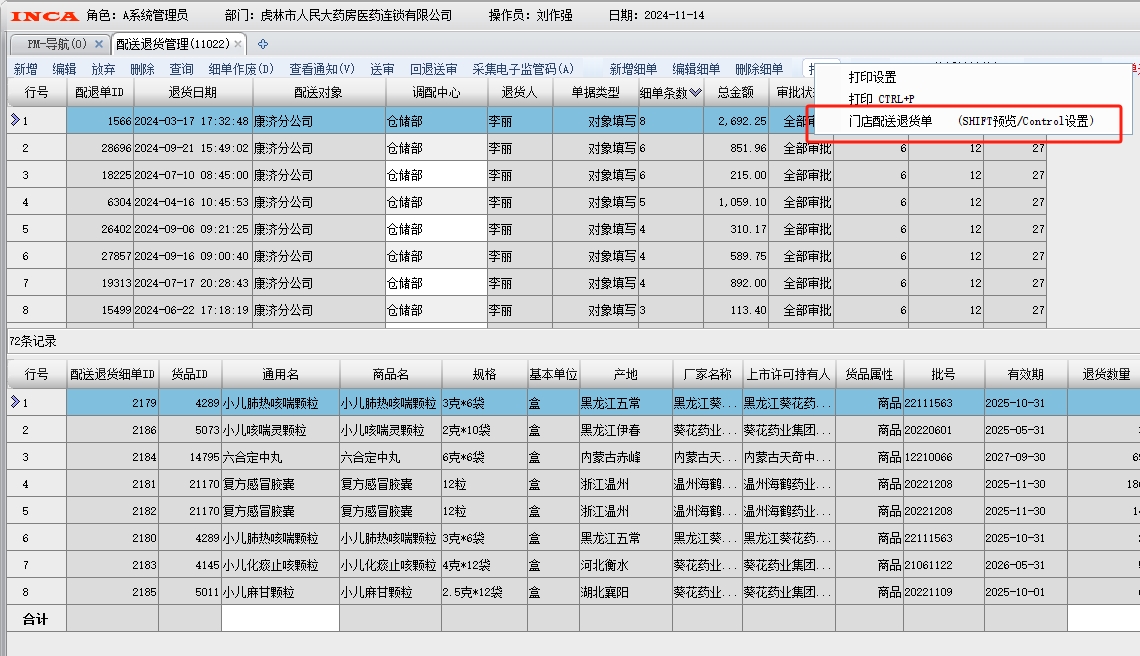 先选中已经被审批通过的配送退货单, 点击 "打印" , 选择 "门店配送退货单"