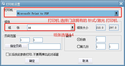 打印机 选择 门店使用的 针式打印机或者是激光打印机 (例如:M1005 MPF 或者 FP-538K 之类的 带有58字样的不是)纸张选择A4.然后点击 确定 .
